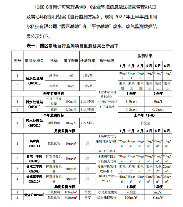 四川潤(rùn)爾科技有限公司自行監(jiān)測(cè)信息公示